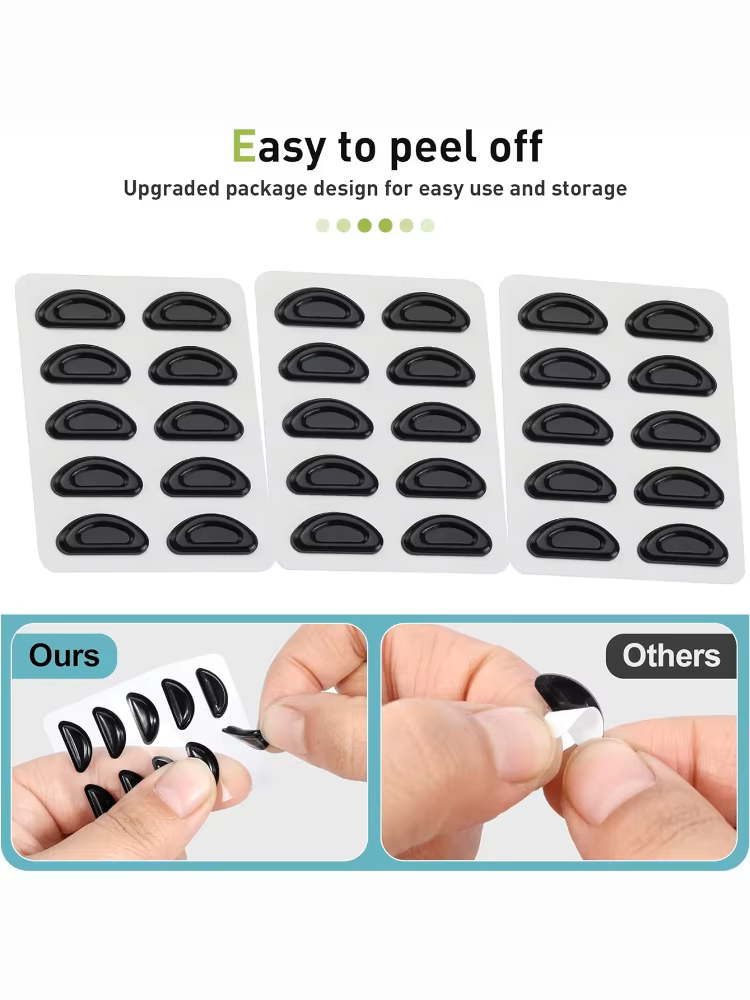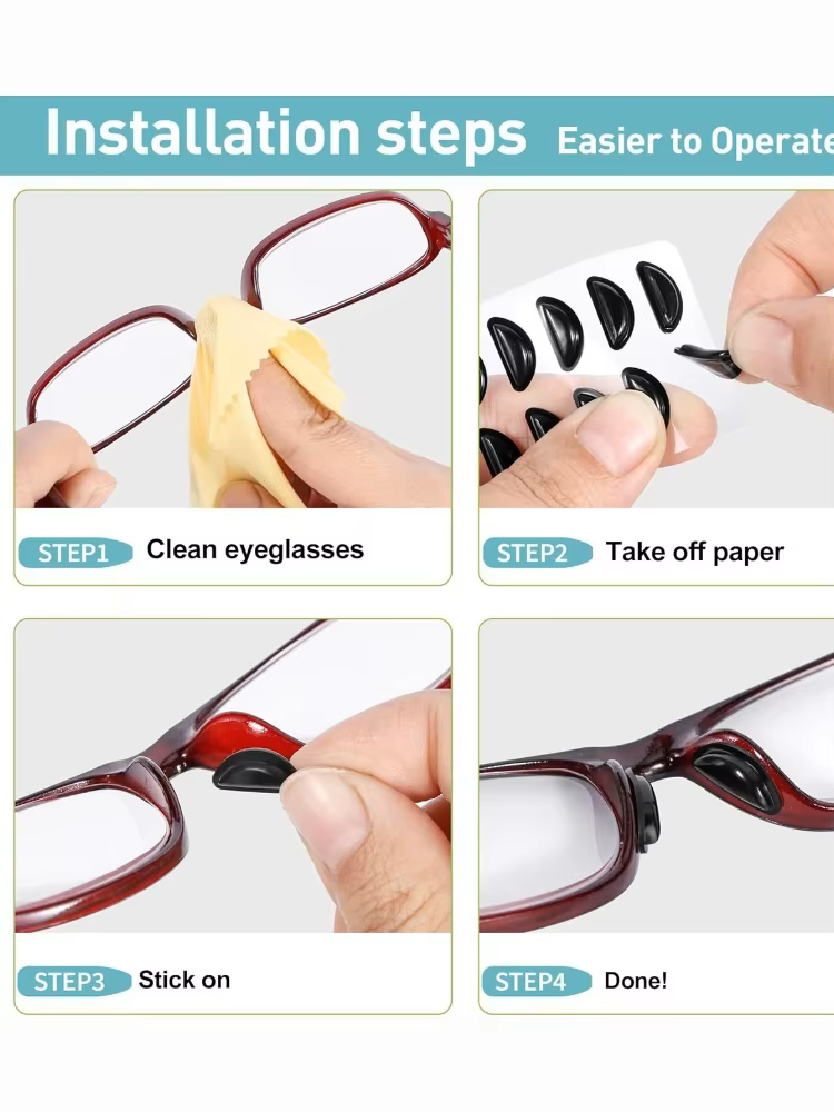 Just peel and stick these self-adhesive nose pads on your eyeglasses.They can reduce the space between the nose and glasses frames. Keep your eyeglasses from slipping and makes frames more comfortable to wear.